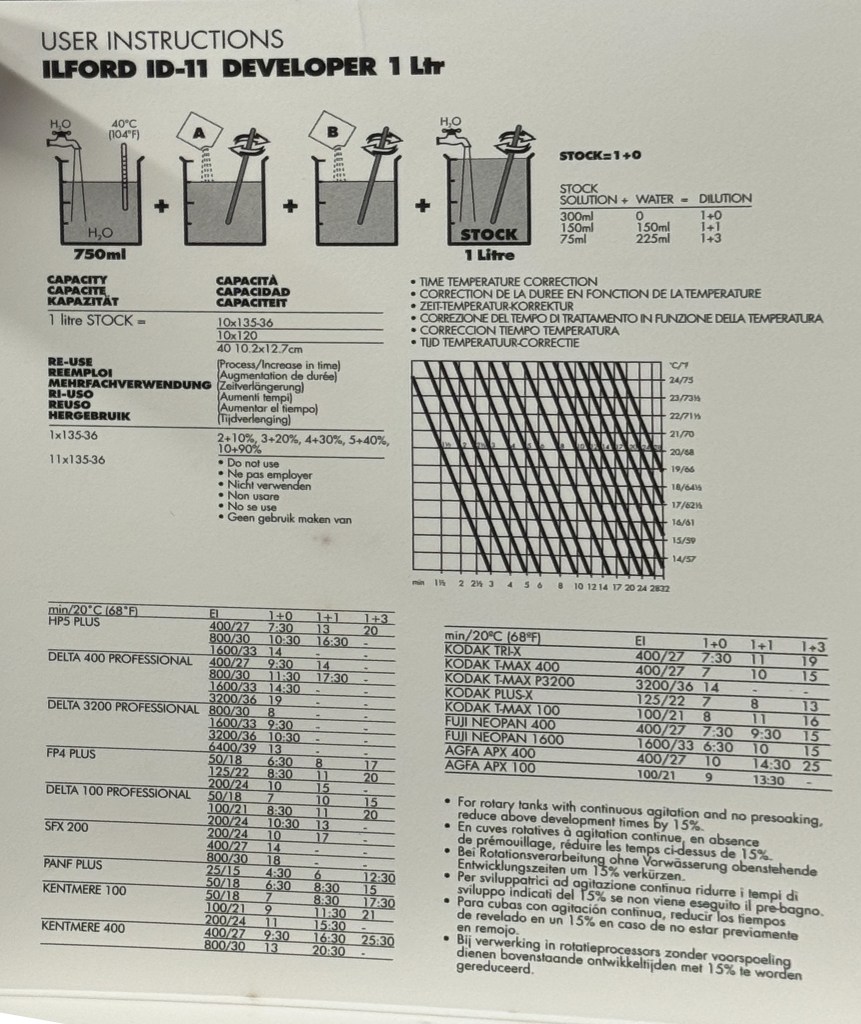 I was trying out the new Harman Kentmere 200, and since there’s only limited data on it, I opted for a no-nonsense developer like ID-11 to get a solid baseline with my first test roll. Ilford recently overhauled the packaging design for most of their products — but what they seem to have conveniently left out are the instructions that used to be part of the packaging for their powder developers.